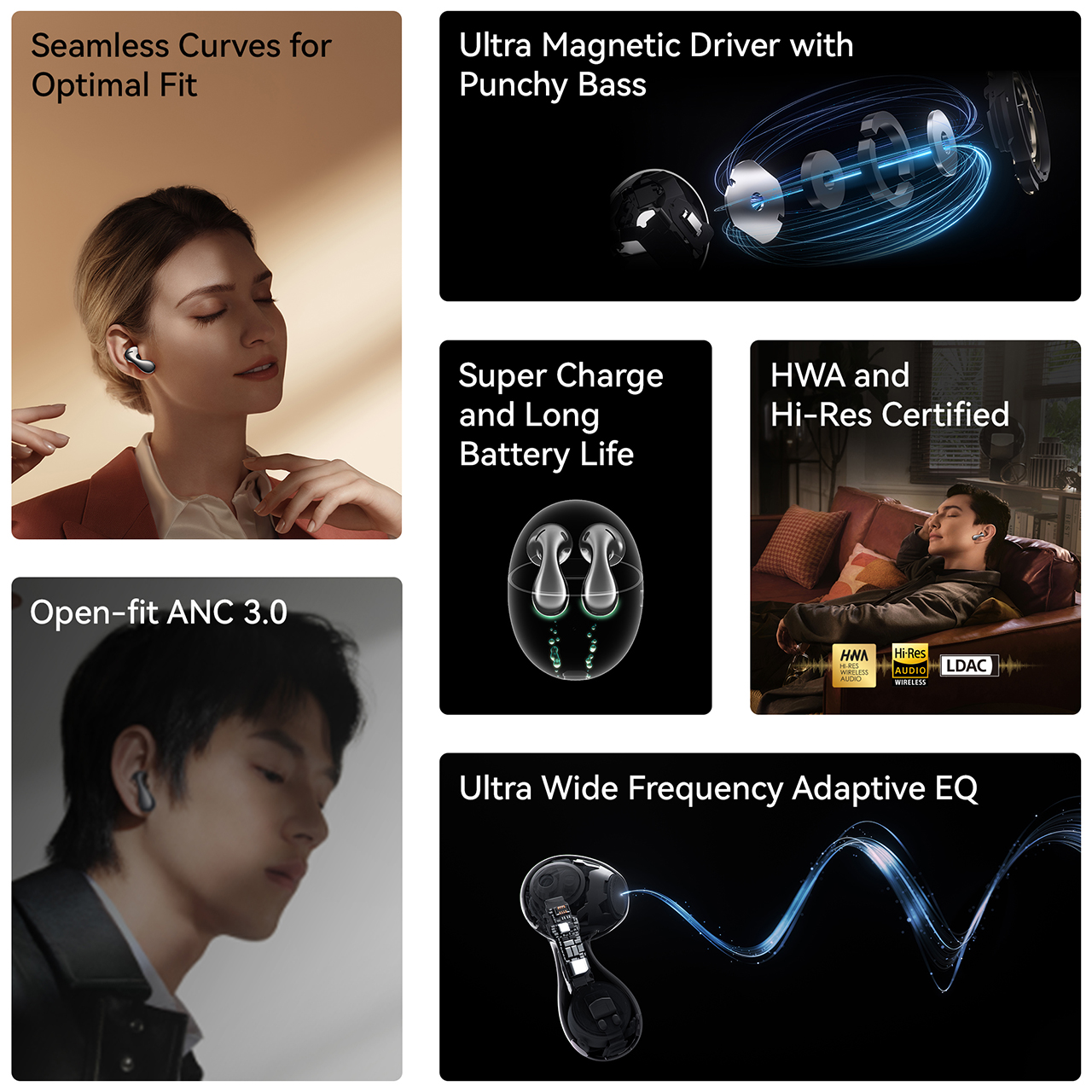 • Ultra Wide Frequency Adaptive EQ | HUAWEI FreeBuds 5 adjusts the sound by accounting for fit, wearing status, and volume level — all the way from 100 Hz to 2000 Hz4 — to provide a personalised listening experience full of passion and pizzazz.