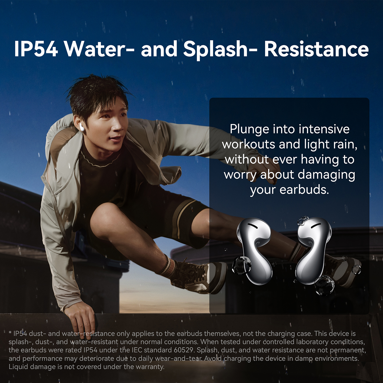 Earbuds: IP54 dust- and splash-resistance