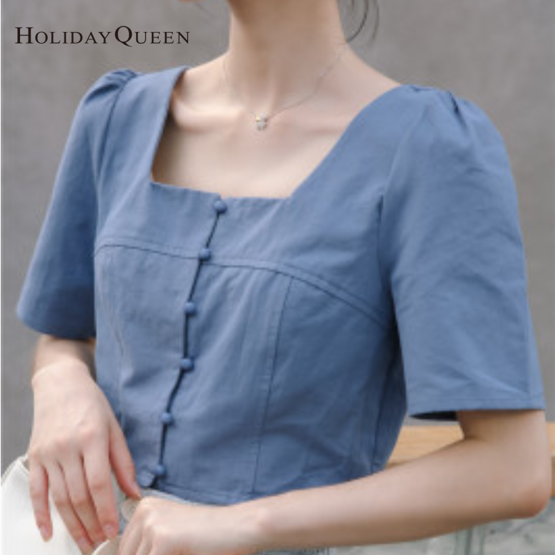 HolidayQueen Summer New Design Short Puff Sleeve Single-breasted Women's Fashion Square Collar Leaky Clavicle Shirt Top Free Shipping HQT0109