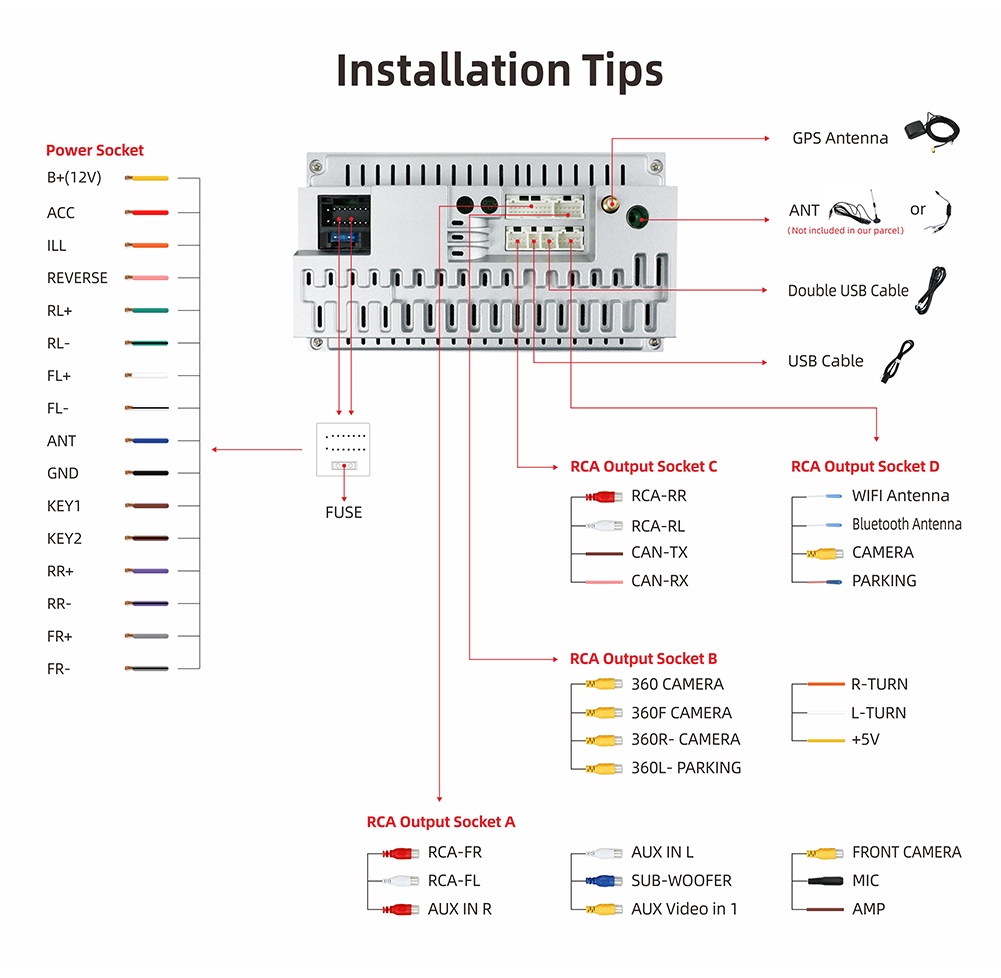 • 15:RCA cables for the subwoofer, power cable plug, and play, easy to install
