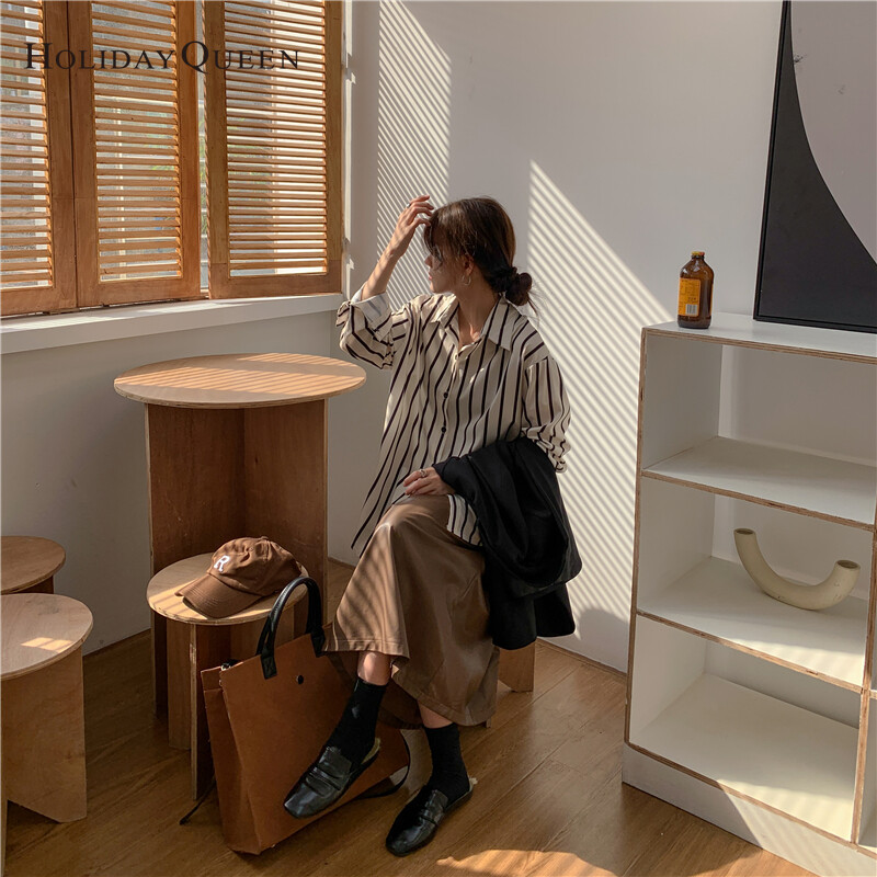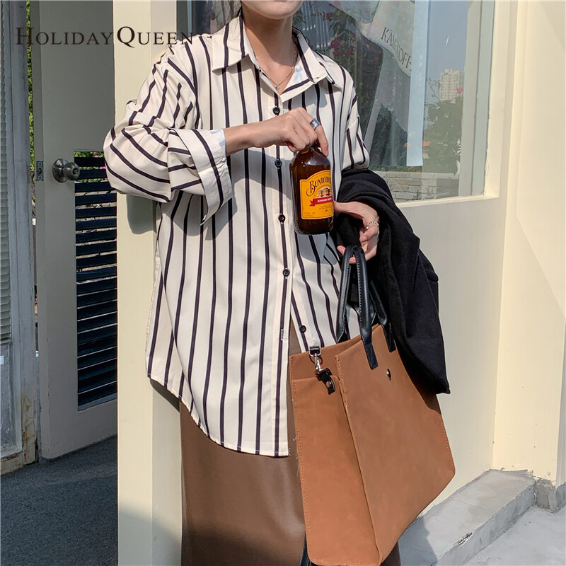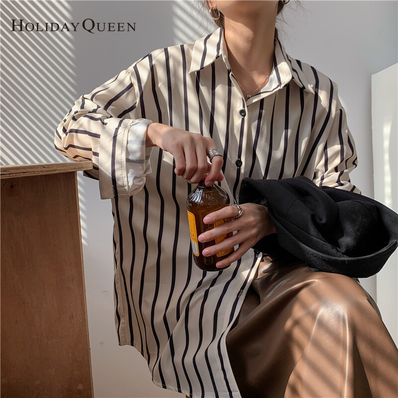 HolidayQueen French All-match Long-sleeved Striped Shirt Women's Design Sense Niche Early Autumn Temperament Tops Lazy Hong Kong Flavor S M L XL Free ShippingWomen's clothing HQ1030