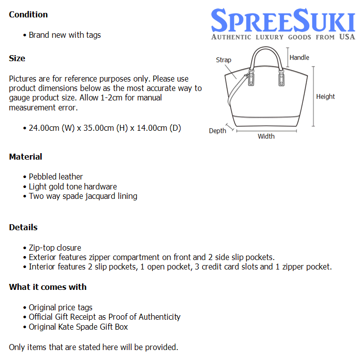 All our products are 100% authentic and purchased from Kate Spade stores in USA. We are a reputable registered business in Singapore and it is illegal to sell counterfeit goods in Singapore. This product also comes with a gift receipt which is printed by the Kate Spade store that we purchased the item from. It states the item that we purchased and the Kate Spade store that it was purchased from, proving the authenticity of the item. Buy with confidence.