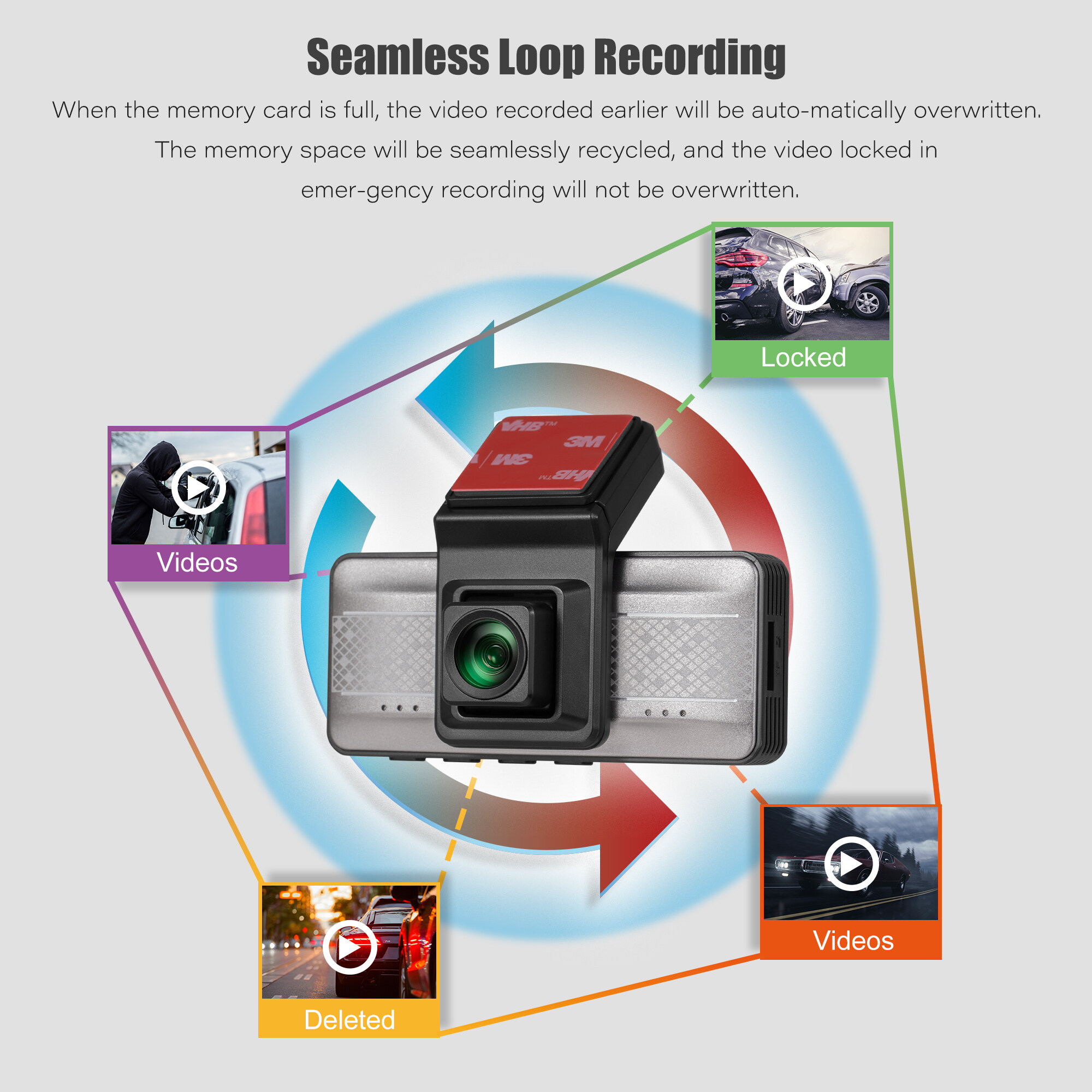 With built-in tri-axis acceleration sensor, the current video vidence can be quickly locked in the event ofa-collision.