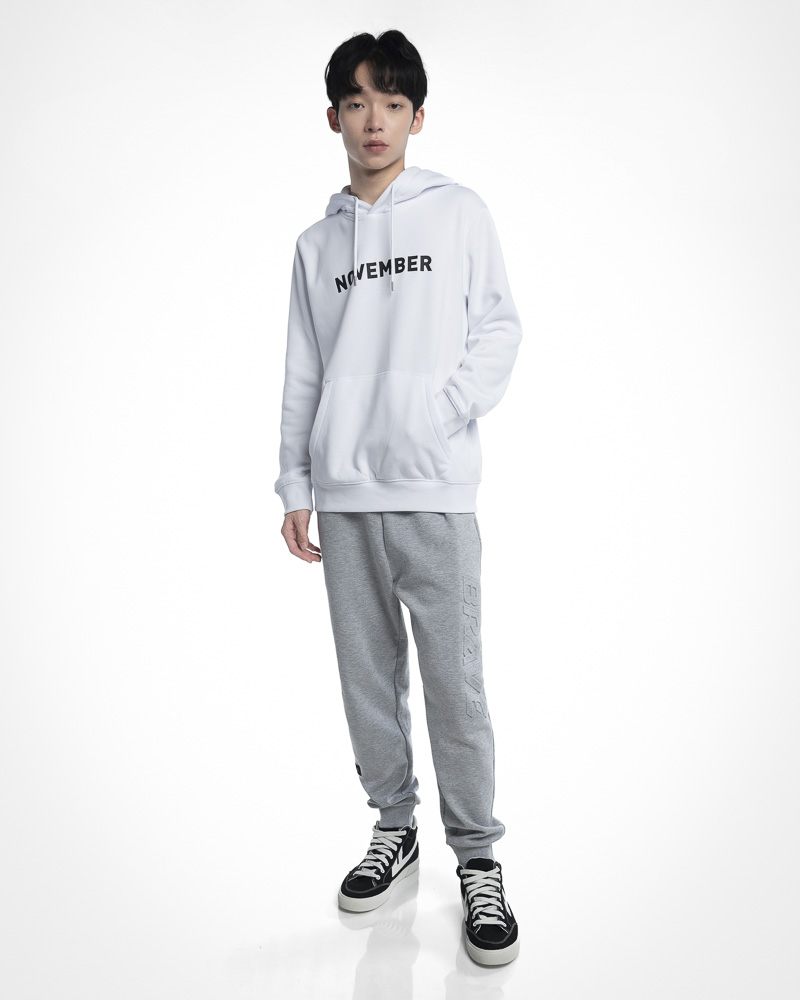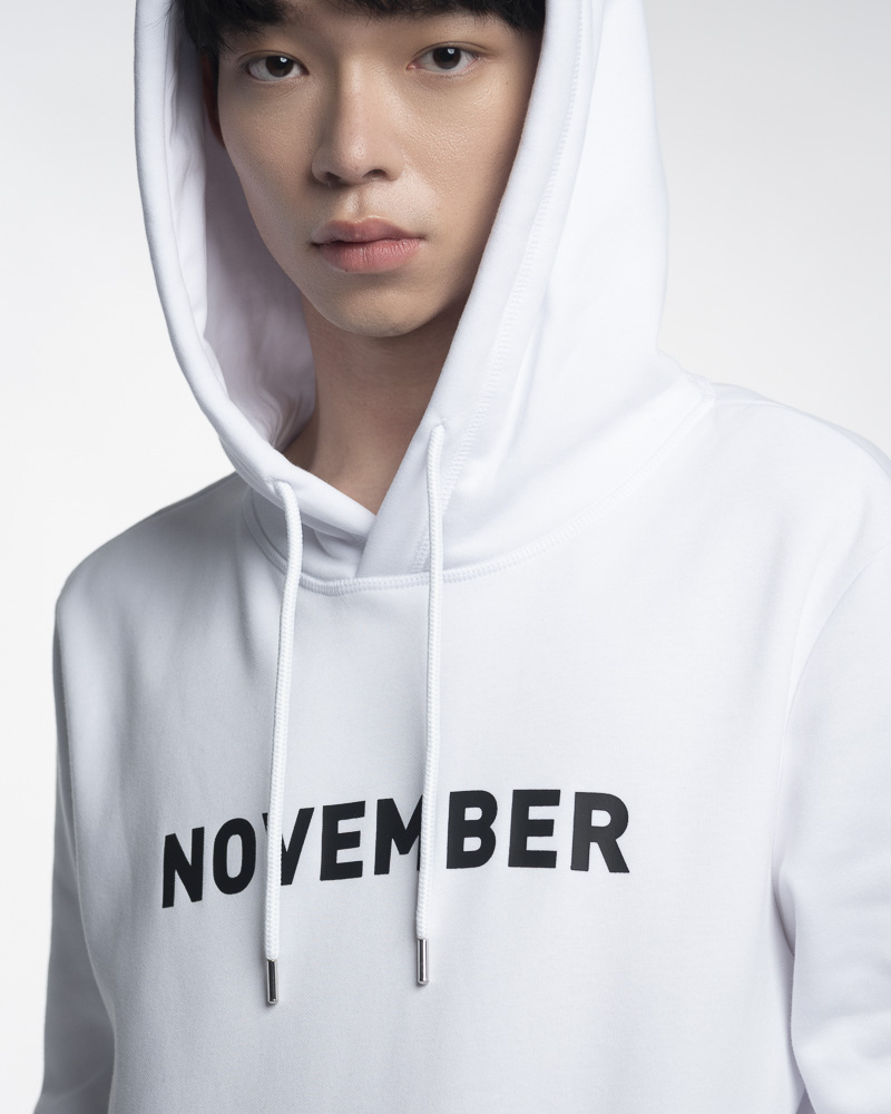 Regular Solid Coloured Long Sleeve Pullover Hoodie with Kangaroo Pockets at the front. Comes with NOVEMBER Slogan Patch at the front. Made of cotton.