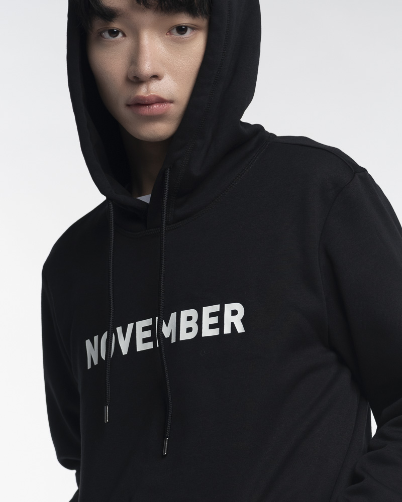 Regular Solid Coloured Long Sleeve Pullover Hoodie with Kangaroo Pockets at the front. Comes with NOVEMBER Slogan Patch at the front. Made of cotton.